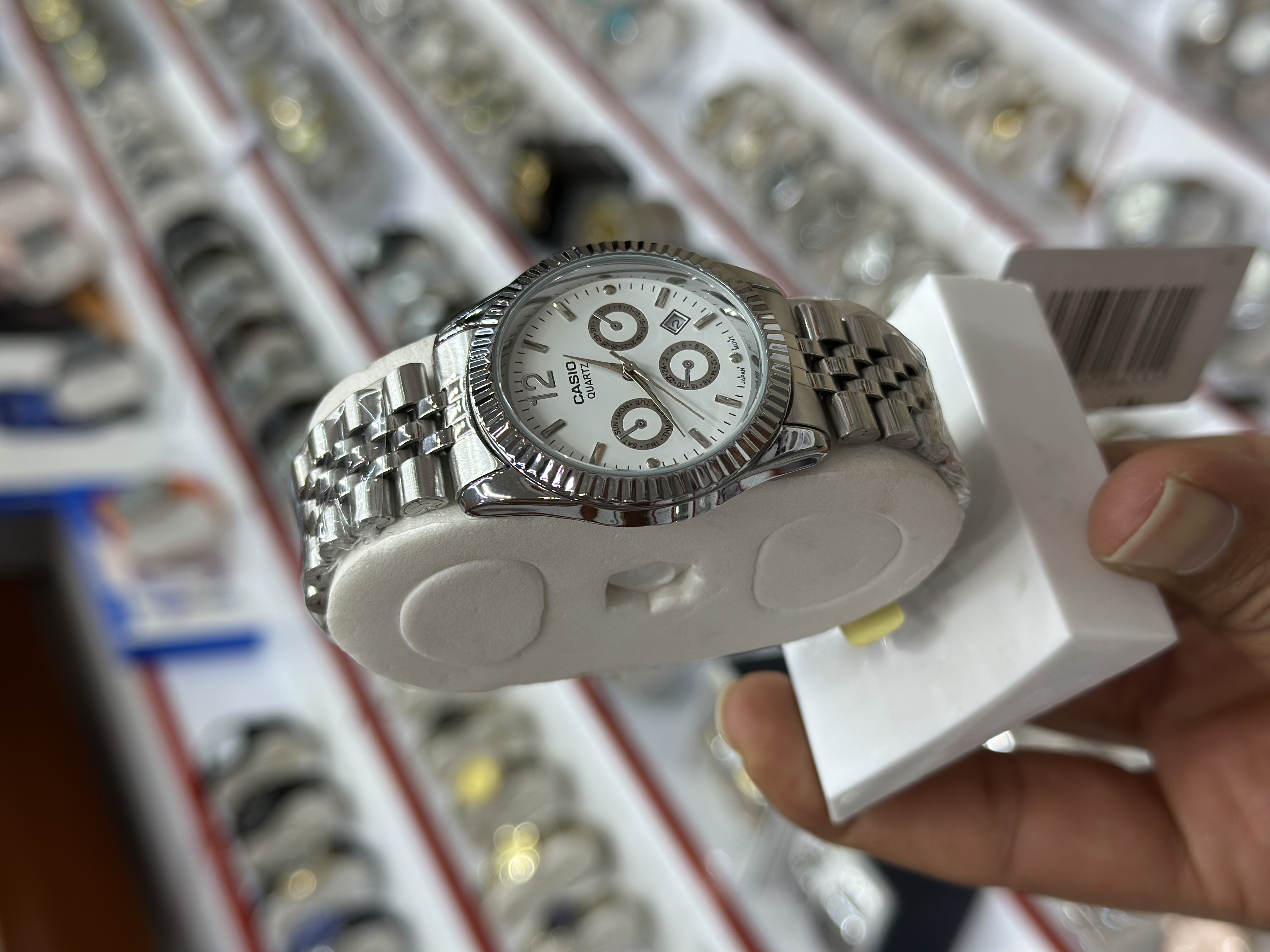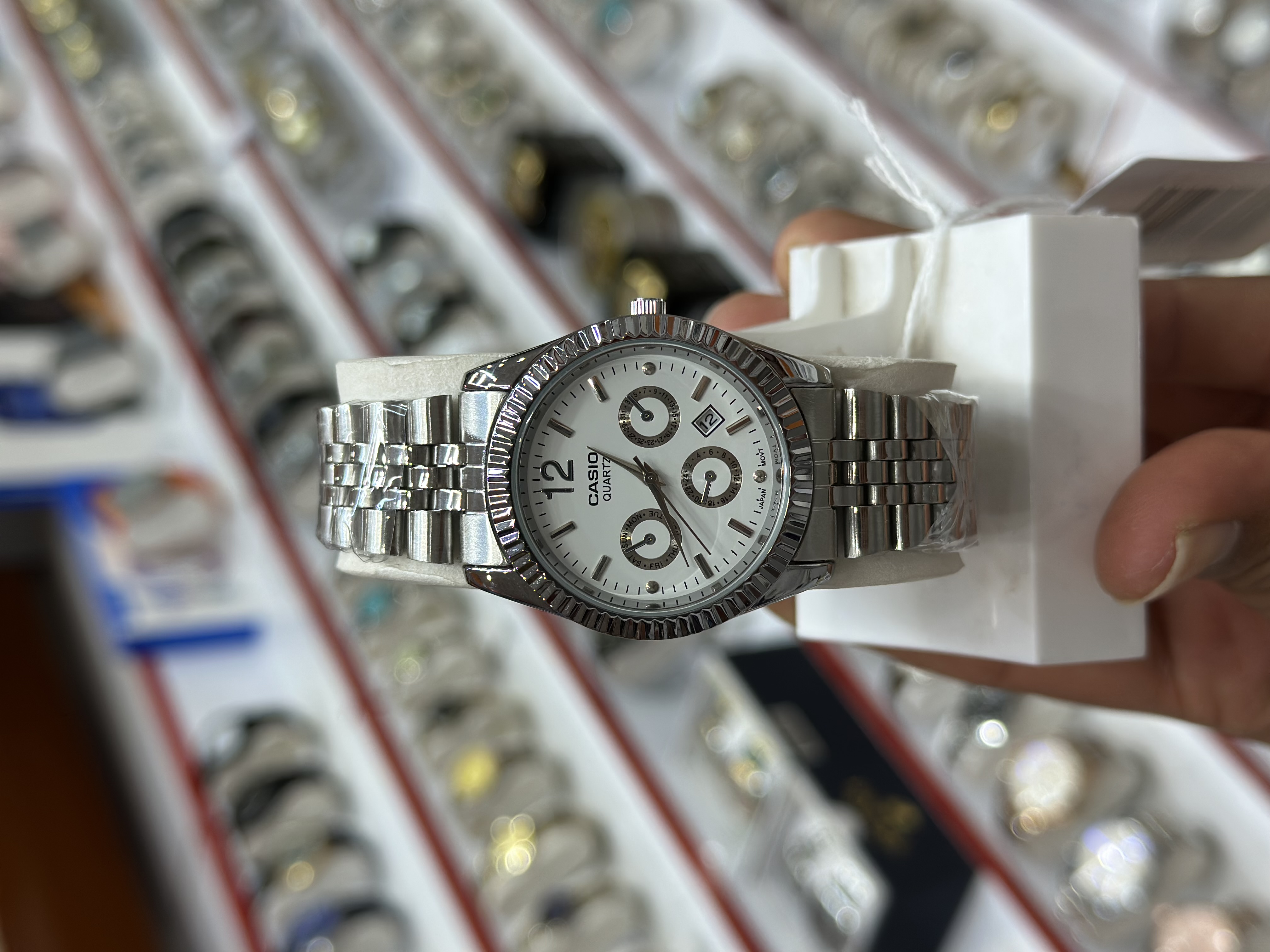 ساعت مردانه کاسیو طرح سه موتور جنس رنگ ثابت و ضدآب دارای تقویم روز شمار قفل بند کلیپسی موتور اصلی قابل تعویض