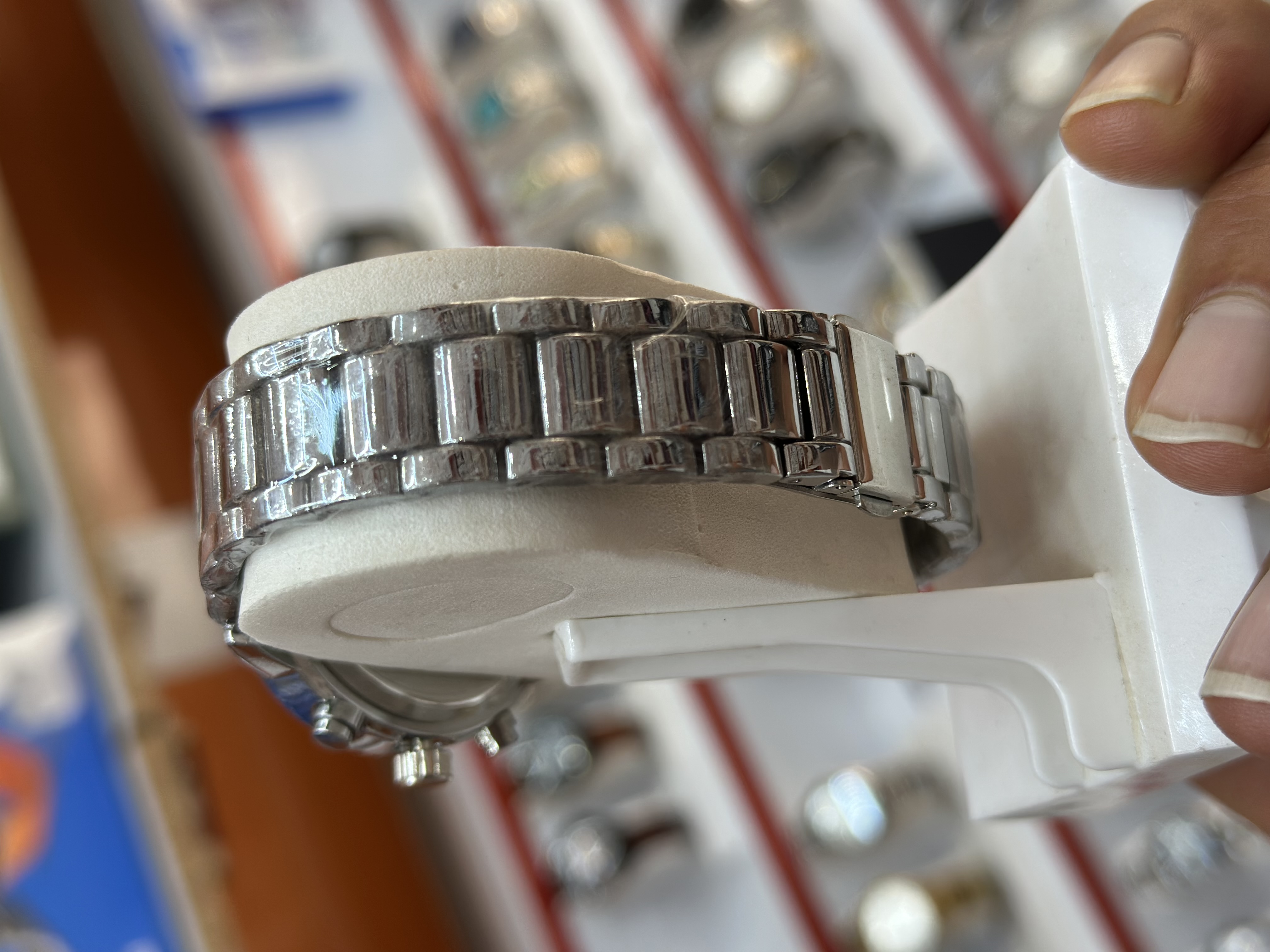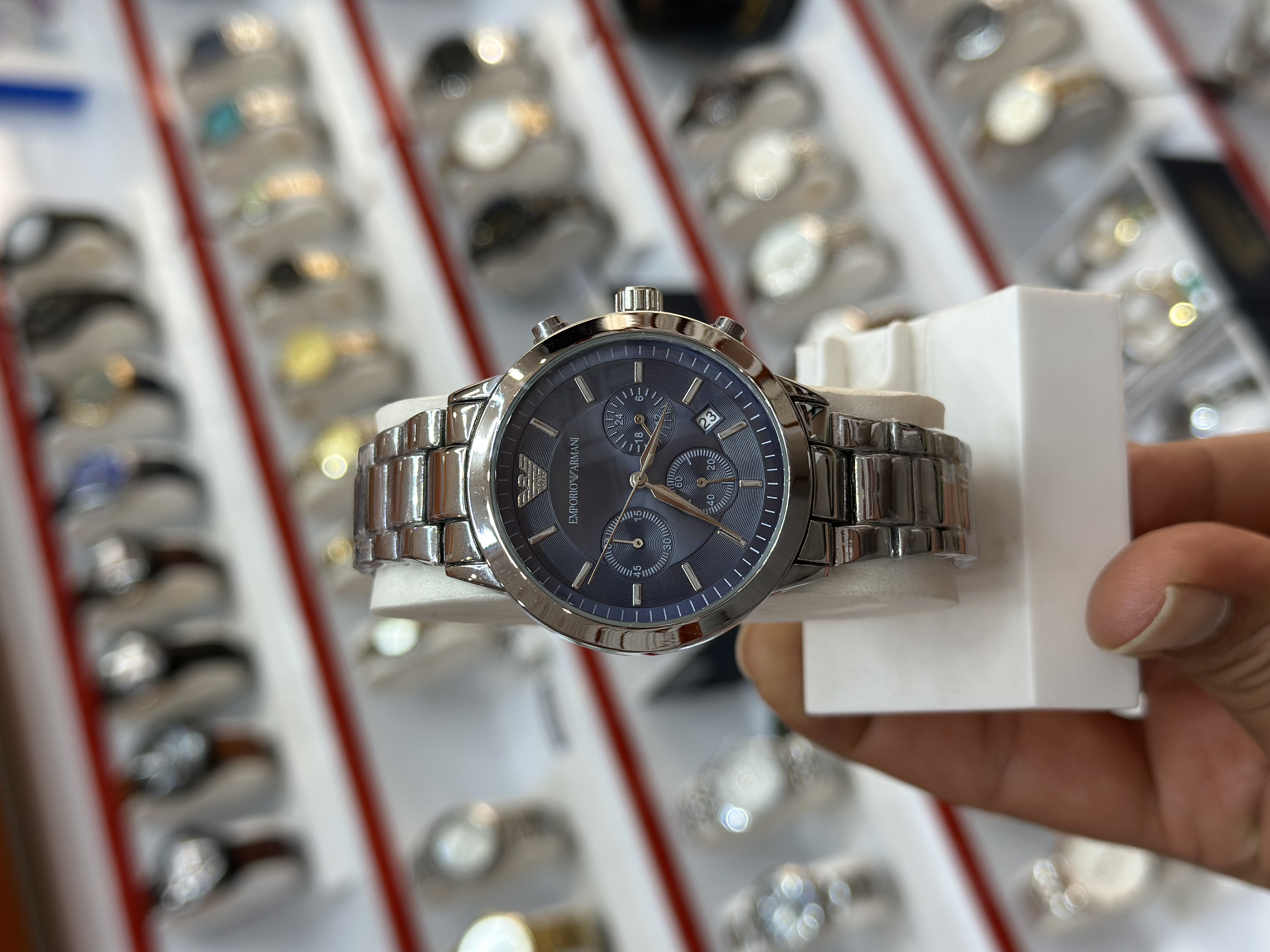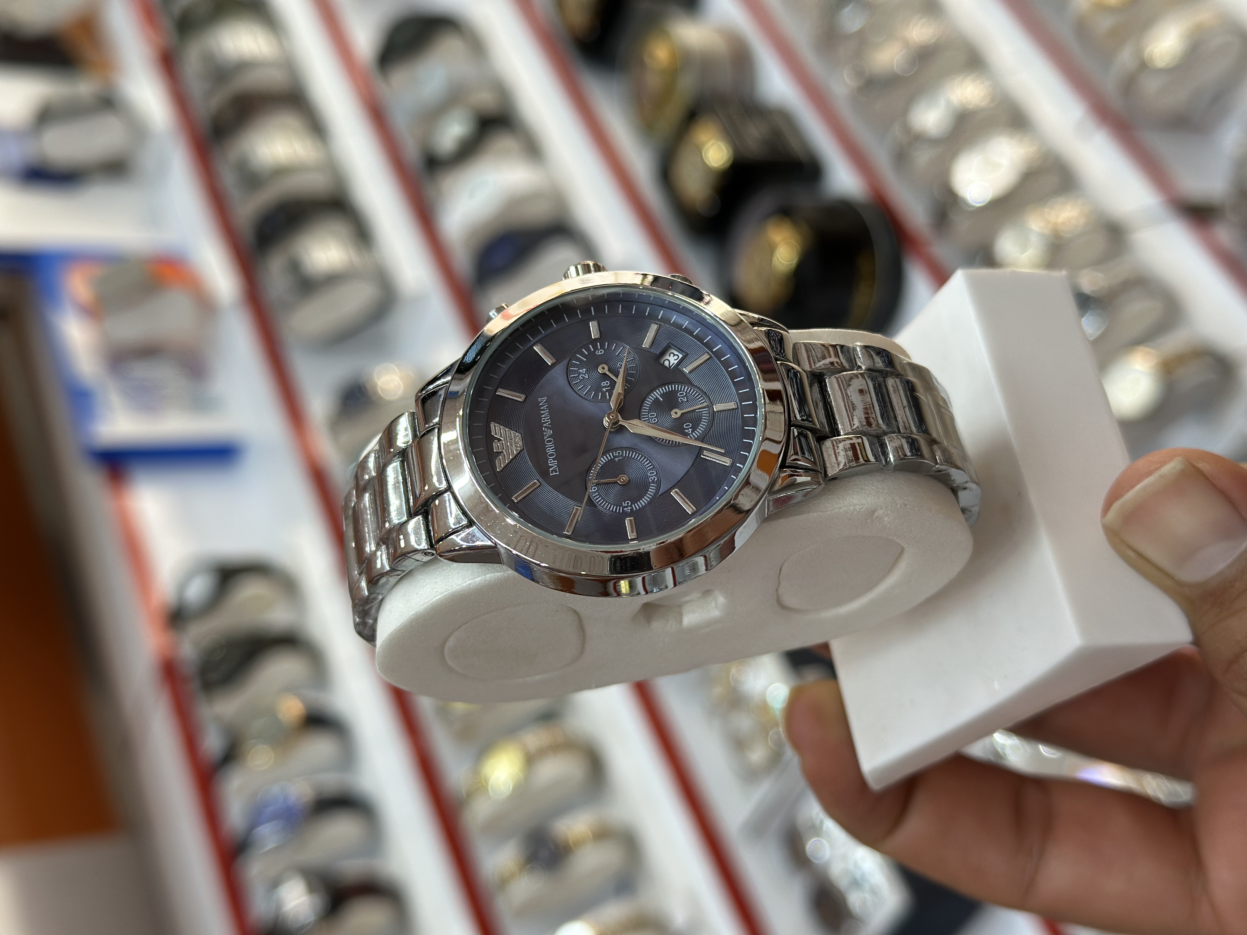 ساعت مردانه سه موتور فعال از برند امپریو آرمانی جنس استیل رنگ ثابت ضدآب دارای تقویم روز شمار قفل بند کلیپسی موتور اصلی